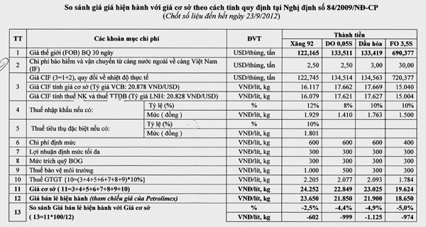 Theo bảng tính giá cơ sở trên, ví dụ để tính giá cơ sở cho thời gian từ 25/8/12 đến 23/9/2012 (kể từ lúc doanh nghiệp đăng ký và Nhà nước điều chỉnh giá vào ngày 28/8 đến thời điểm các doanh nghiệp đề nghị điều chỉnh giá lần tiếp theo) phải dựa vào bình quân giá xăng dầu thế giới trong vòng 30 ngày.