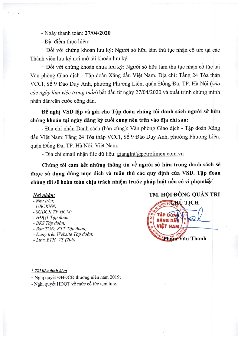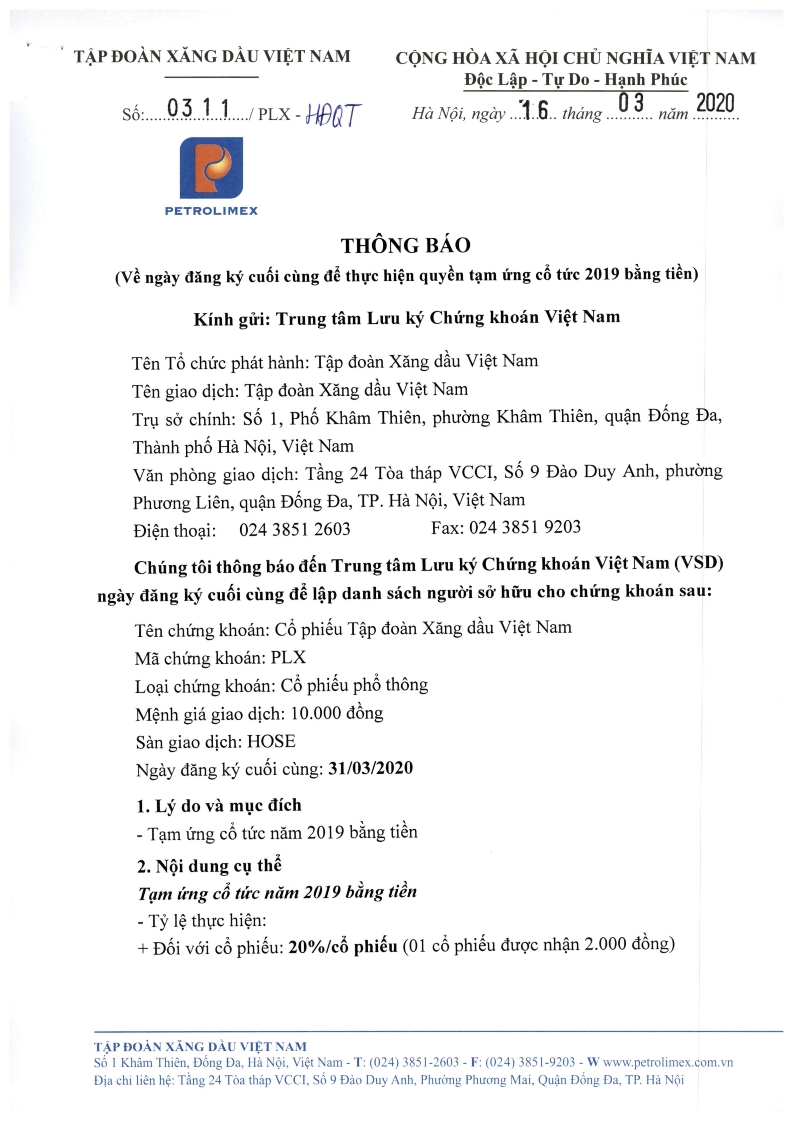 Ngày đăng ký cuối cùng để thực hiện quyền tạm ứng cổ tức 2019 bằng tiền