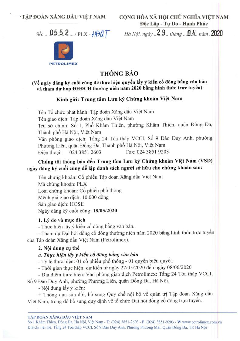 Thông báo về ngày đăng ký cuối cùng để thực hiện quyền lấy ý kiến cổ đông bằng văn bản và tham dự họp ĐHĐCĐ thường niên 2020 bằng hình thức trực tuyến